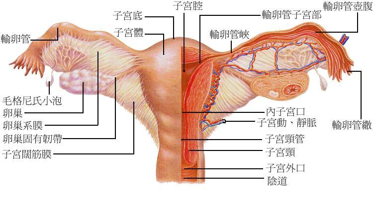 輸卵管前側與卵巢藉著寬韌帶連接在一起,末端有個像喇叭狀的構造,